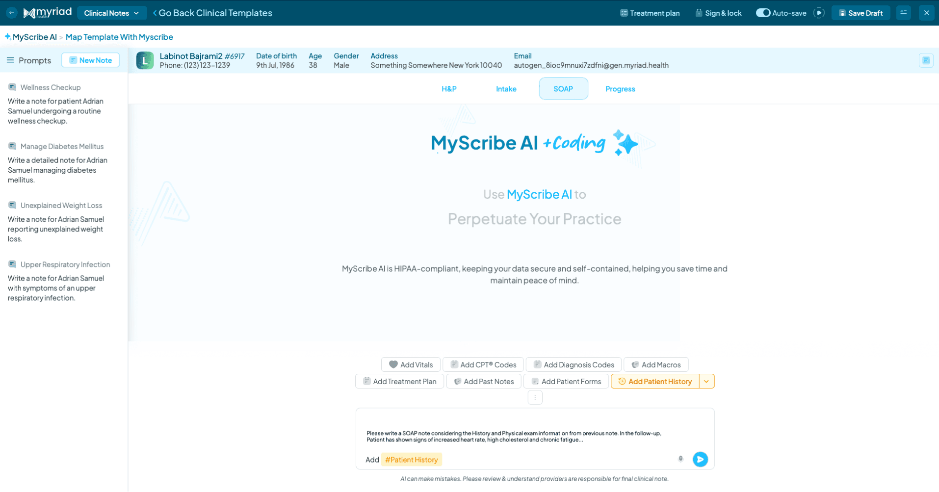MyScribe AI is a secure, ONC-certified clinical charting solution built to reduce documentation overload through intelligent automation, ambient transcription, customizable templates, and smart coding suggestions. MyScribe AI operates in an ONC-certified, HIPAA-compliant system integrated into Myriad Health™. It ensures secure, efficient, and specialty-adaptable charting that helps providers reclaim time for patient care.