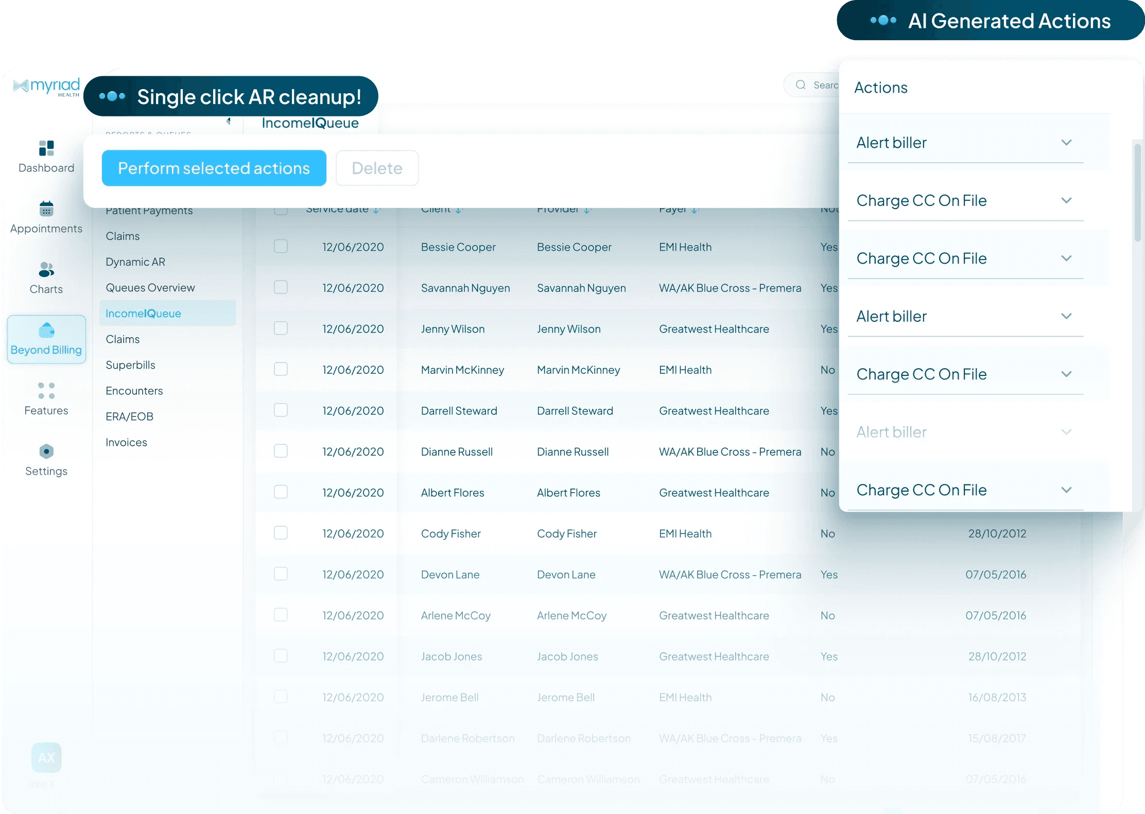 Myriad Health™ introduces the first of its kind Revenue Cycle Management tool, IncomeIQueue. This tool integrates seamlessly with our exclusive Healthcare Payment Program to track encounters from visit to claim and allow quick actions to clean up insurance AND patient AR instantly.