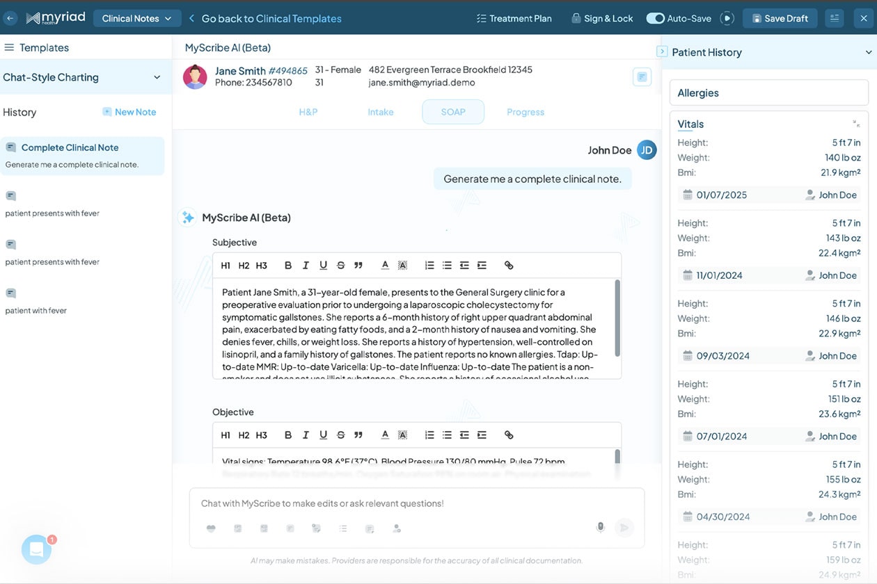 MyScribe AI is Myriad Health’s built-in AI charting assistant. It turns brief inputs into structured clinical notes, tailored to your specialty and templates, saving you time and protecting your bottom line.